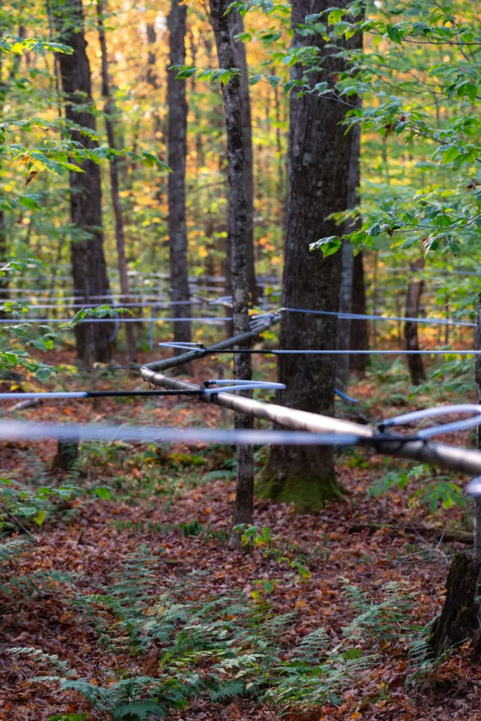 At the start of each year, we head into the woods and start tapping the trees. To do this, we drill a small hole in each tree and hammer in a spile or ‘tap’ that is connected to a vast network of pipes and tubing. When spring comes, the sap that has been sitting frozen in the trees’ roots starts to travel up towards the leaves, in preparation for new growth. When this happens, a portion of the sap comes out through the tap and travels down the pipes to our sugarhouse.