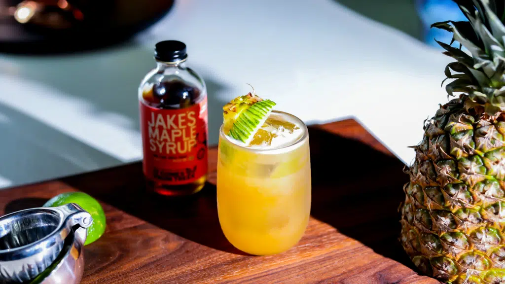 Garnish with wedge of lime and pineapple slice.