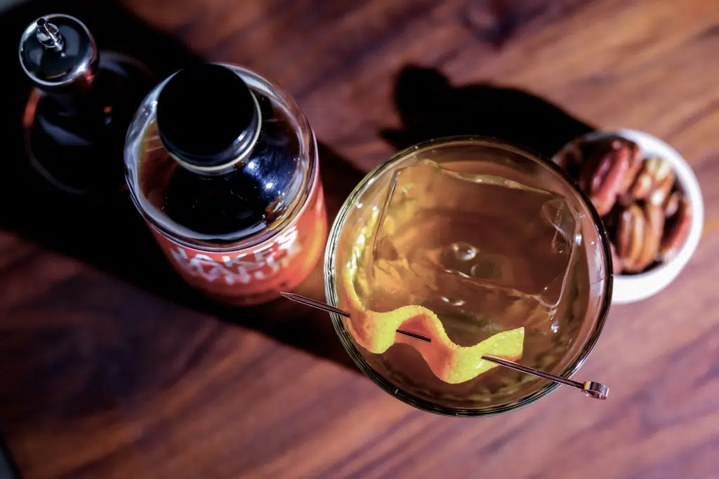 Fill with ice and finish with a twist of orange, serve pecans in a small bowl on the side.